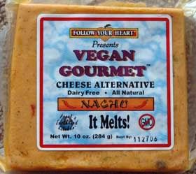 This vegan cheese melts. It tastes a little weird but is delicious. Follow Your Heart nacho, as you might predict, makes excellent nachos (microwave). It's also interesting when used for mac and cheese or to top a baked potato. Basically, the nacho flavor is the Vegan Gourmet cheddar with chunks of peppers in it and some spices throughout. This makes it a little softer and more crumbly than the other flavors.