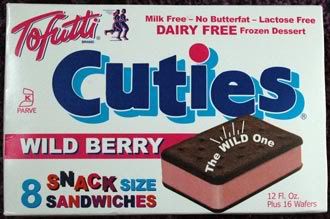 If you haven’t tried Tofutti Cuties, you are missing out. These delightful ice cream sandwiches have wonderful flavor and texture and are a convenient snacking size at a good price. They taste best when the ice cream is just slightly melted and beginning to drip around the edges. But put the sandwich into a bowl if you don’t want the wafer parts to stick to the wrapper in your warm hands! The wild berry is my favorite variety.